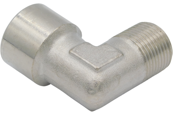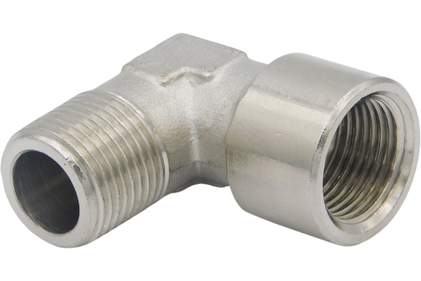 Winkelstück mit konischem Außen- und zylindrischem Innengewinde bis 20 bar.