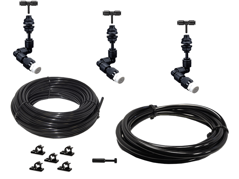 Der Beregnungsanlagen Bausatz kann später auch um zusätzliche Düsen erweitert werden, je nach gewähltem Pumpenmodell und dessen Förderleistung. So können bei der Pumpe Small bis zu 8 Sprühdüsen, beim Modell Standard bis zu 15 Düsen mit je 80° Sprühwinkel betrieben werden.