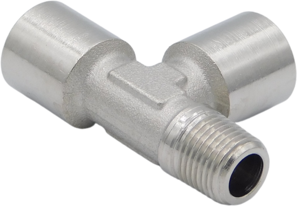 Druckbeständiger T-Fitting mit konischem Außengewinde und zylindrischen Innengewinden im 90° Winkel für zahlreiche Anwendungen mit flüssigen und gasförmigen Medien bis zu einem Betriebsdruck von 20 bar geeignet.